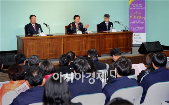 강운태 광주광역시장은 13일 ‘2014 산업단지 문화재생사업 추진설명회’가 열린 소촌농공ㆍ산업단지를 방문하고 노후공단 문화재생 프로젝트인 ‘아트팩토리사업’을 통해 아트힐링공간 등 조성해 근로자·주민 문화욕구 충족시켜 나갈 것임을 밝혔다.