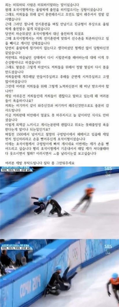 [아시아경제 온라인이슈팀] 쇼트트랙 국가대표 이호석 선수에 대한 비난이 커지자 쇼트트랙 국가대표 신다운 선수가 사람들에게 그만 비난할 것을 당부했다.신다운은 14일 대한체육회 소셜네트워크서비스(SNS) 트위터를 통해 이호석 선수의 비난에 대한 자신의 심정을 토로했다.신다운은 "죄는 미워하되 사람은 미워하지 말라는 말이 있습니다"며 "지금 저희한테 미안해서 얼굴도 못 마주치시고 늘 같이하던 식사도 안하셨습니다. 이렇게 죄책감 느끼고 계시는 분한테 괜찮다고 위로는 못해 줄망정 욕 하는 것이 말이나 되는 일인가요"라고 말했다.또 "며칠 전 1500에서 넘어지고 절망의 구렁텅이에서 헤 메이고 있을 때 제일 먼저 정신 차리라고 손 뻗어 준 사람이 호석이형이었습니다. 이제는 호석이형께서 구렁텅이에 빠져 계시네요. 이번에는 제가 손을 뻗어드리고 싶습니다"라고 덧붙였다. 신다운의 글에 따르면 이호석은 이번 소치 올림픽에 참가하지 않기로 됐었다. 하지만 국가대표 쇼트트랙 노진규 선수의 암투병으로 노진규 선수의 출전이 불가능해지자 이호석이 대신 투입된 것이다. 이호석은 열심히 훈련에 임했고 계주메달 만들어 주려는 등 후배들을 위했음을 신다운의 글을 통해 느낄 수 있다.한편 대한체육회 측은 "가장 필요한 것은 격려와 응원입니다. 욕설이나 화풀이가 아닙니다"라며 신다운 선수의 글에 공감했다.신다운 선수의 관련 글을 접한 네티즌은 "신다운, 좋은 선배를 두셨네요", "신다운, 쇼트트랙 국가대표 선수들 화이팅", "신다운, 이호석 선수 기운 내시길 바랍니다" 등의 반응을 보였다. 온라인이슈팀 <ⓒ세계를 보는 창 경제를 보는 눈, 아시아경제(www.asiae.co.kr) 무단전재 배포금지>온라인이슈팀 <ⓒ아시아 대표 석간 '아시아경제' (www.newsva.co.kr) 무단전재 배포금지>