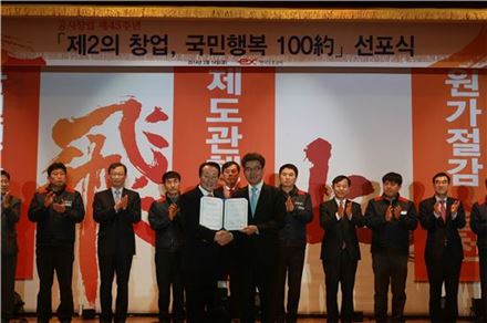 [아시아경제 이민찬 기자]한국도로공사(사장 김학송)는 14일 경기 성남 소재 본사 대강당에서 창립 45주년을 맞아 '제2의 창업·국민행복 100약' 선포식을 가졌다. 도로공사는 앞으로 ▲통일희망나무 ▲청년창업 창조경제휴게소 ▲일반신용카드로 통행료 지불 ▲정품·정량·정가의 ex주유소 등을 추진하기로 했다.이민찬 기자 leemin@asiae.co.kr<ⓒ세계를 보는 창 경제를 보는 눈, 아시아경제(www.asiae.co.kr) 무단전재 배포금지>