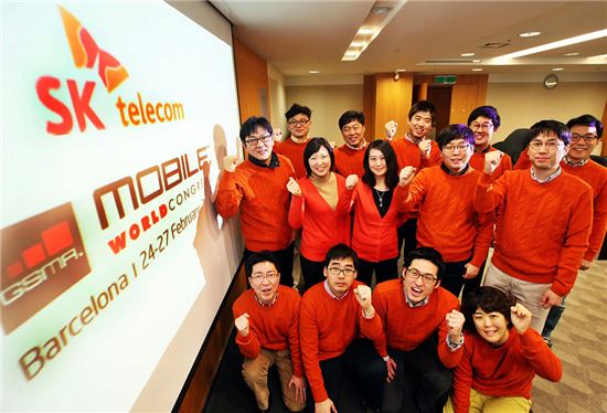 ▲SK텔레콤은 오는 24일부터 스페인 바르셀로나에서 열리는 모바일월드콩그레스(MWC) 2014에 석·박사급 실무자 30명을 파견하기로 하고 출정식을 열었다. 파견되는 전문가들은 주요 전시관을 둘러보고 다양한 회의에 참석하는 등 ICT 서비스와 기반 기술을 깊이 연구하게 된다.