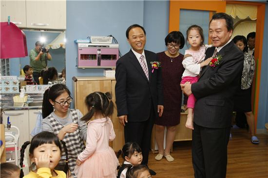 노현송 서울 강서구청장(오른쪽)이 하늘샘 어린이집 개원식에 참석, 어린이를 안고 있다.