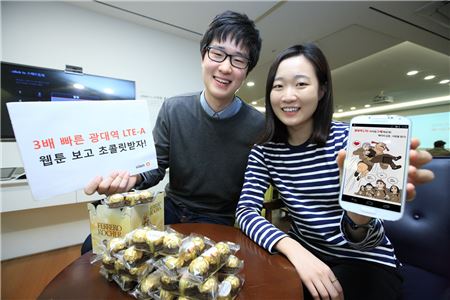 KT는 ‘3배 빠른, 많은, 넓은’ 광대역 LTE-A의 우수성을 쉽게 알리기 위해 웹툰 시리즈를 제작하고, SNS상에서 웹툰 공유를 하면 페레로로쉐 초콜릿을 증정하는 이벤트를 진행한다.