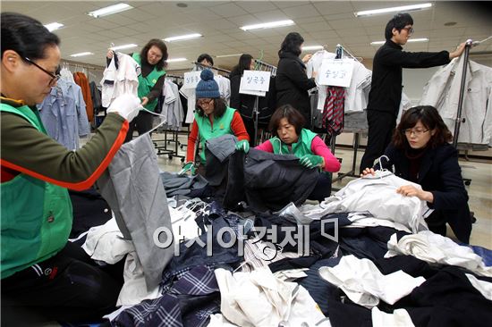 [아시아경제 노해섭 기자]신학기를 맞아 18일 광주 북구 일곡동주민센터(동장 김옥중) 직원들과 새마을부녀회원들이 회의실에서 ‘사랑의 교복 나눔 행사’에 내 놓을 교복을 학교별로 분류하고 있다. 교복 한 점당 1천원에서 5천원에 판매 될 이번 교복 나눔 행사는 오는 20일과 21일 이틀간 주민센터에서 열린다. 사진제공=광주시 북구노해섭 기자 nogary@<ⓒ세계를 보는 창 경제를 보는 눈, 아시아경제(www.asiae.co.kr) 무단전재 배포금지>