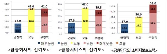 매년 11~12월 중 對국민 서베이 실시금융소비자 불만 등 수렴해 정책에 반영[아시아경제 김혜민 기자] 국민 절반 이상이 정부의 소비자보호 노력이 미흡했다고 평가한 것으로 드러났다. 금융회사에 대한 신뢰도와 보안안정성에 대한 인식도 부정적이었다. 금융위원회는 20일 이런 내용을 담은 금융소비자 인식조사 결과를 '2014년 업무계획'을 통해 발표했다. 이번 설문조사는 일반소비자 500명과 금융전문가 103명을 대상으로 지난 3일부터 10일 간 이뤄졌다.