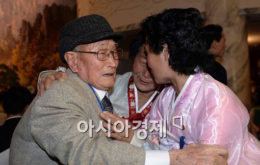 [아시아경제] 2014 설 계기 남북 이산가족상봉 행사 첫 날인 20일 북한 고성 금강산 호텔에서 열린 단체상봉행사에서 남측의 류영식(92.왼쪽)씨가 북측의 조카들을 만나고 있다./금강산=사진공동취재단 <ⓒ세계를 보는 창 경제를 보는 눈, 아시아경제(www.asiae.co.kr) 무단전재 배포금지>