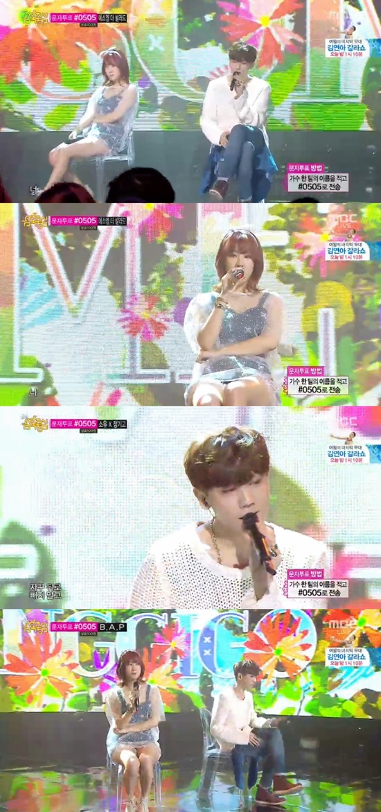 [아시아경제 e뉴스팀]씨스타 소유와 정기고가 함께하는 소유X정기고가 감성적인 노래로 청중의 귓가를 사로잡았다.소유X정기고는 22일 오후 방송된 MBC '음악중심'에 출연해 신곡 '썸'을 열창했다. 이들은 달콤한 가사와 가슴을 두근거리게 만드는 달콤한 목소리로 팬들의 뜨거운 박수와 환호를 자아냈다.'썸'은 소울 감성 가득한 정기고 특유의 로맨틱한 보컬에 씨스타 소유의 청아한 음색이 어우러져 듣는 이의 가슴을 두근거리게 하는 미디엄 템포의 듀엣송이다. 여기에 최근 힙합대세로 떠오른 긱스 릴보이의 톡톡 튀는 감각적인 랩이 더해졌다.한편 이날 '음악중심'에는 S.M. THE BALLAD, 선미, B1A4, 소유 X 정기고, 태진아, B.A.P, 가인, 박지윤, BTOB, 방탄소년단, 스피카, 씨클라운, 김바다, 탑독, 레이디스코드, 스피드, 소년공화국, 샘, 립서비스, Bebop, 임채언 등이 출연했다.e뉴스팀 ent@asiae.co.kr<ⓒ세계를 보는 창 경제를 보는 눈, 아시아경제(www.asiae.co.kr) 무단전재 배포금지>