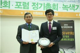상을 받은 국립산림과학원 기후변화연구센터 김래현(오른쪽) 박사가 기념사진을 찍고 있다.