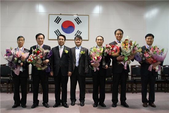 왼쪽부터 황공용 약사(서울지부), 김일룡 약사(광주지부), 조찬휘 대한약사회장, 김상진 한독 부사장, 이규진 약사(충북지부), 김승재 약사(경기지부), 옥순주 약사(전남지부)가 시상식 후 기념촬영을 하고 있다.