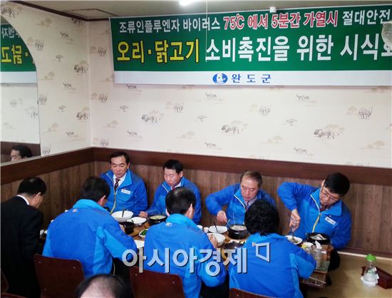 [아시아경제 김승남기자]완도군은 오리, 닭 사육 농가 및 음식점 등의 판매촉진을 위해 관내 음식점에서 시식행사를 가졌다고 27일 밝혔다.이번 행사는 완도군 부군수 및 실과장 등 30여명이 시식행사에 참석했으며, 전국적으로 발생한 AI 발생으로 오리·닭고기 소비 급감에 따른 농가 및 음식점의 어려움 해소 및 소비촉진을 위해 마련했다. 심만섭 친환경농업과장은 “시중에서 유통되는 오리·닭고기와 계란은 위생적인 시설에서 철저한 검사를 통하여 생산되고 있으며, 75℃에서 5분간 가열하면 AI 바이러스가 사멸하여 인체에 전혀 해가 없다”고 말했다. 한편, 완도군은 매주 월요일을 닭?오리고기 먹는 날로 지정해 소비촉진을 위한 활동을 전개하고, 철저한 AI방역활동을 지속할 방침이다.노해섭 기자 nogary@<ⓒ세계를 보는 창 경제를 보는 눈, 아시아경제(www.asiae.co.kr) 무단전재 배포금지>
