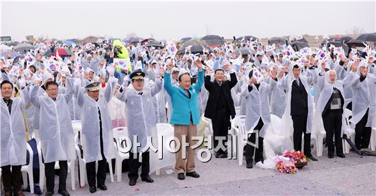 이와 함께 여수 지역 독립유공자 40명의 숭고한 희생정신을 기념하기 위해 건립되는 ‘여수항일운동기념탑’ 기공식이 함께 거행돼 주목을 끌었다. 김충석 여수시장은 기념사를 통해 “선열들이 피 땀흘려 이룩한 터전위에서 세계박람회를 성공적으로 개최해 ‘세계 4대 미항’으로 우뚝섰고 천만 관광객시대를 활짝 열수 있었다”고 강조했다.‘제95주년 3·1절 기념식’을 1일 오전 여수 웅천하나로공원에서 시민 2000여명이 참석한 가운데 개최됐다. 김충석 시장을 비롯한 내빈들이 항일운동기념탑 기공 테이프컷팅을 하고 있다.