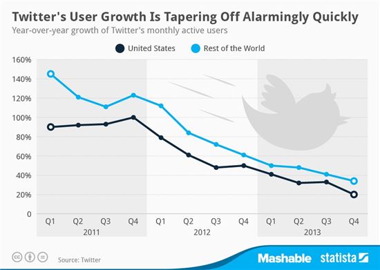 [아시아경제 조유진 기자] 트위터의 성장률이 빠르게 하락하고 있다. 1일(현지시간) 미국 정보기술(IT) 전문 매체 매셔블은 온라인 통계 기업 스테이티스타 자료를 인용해 미국을 포함한 전 세계에서 트위터의 월간 활동 이용자 증가율이 빠르게 감소하고 있다고 전했다. 월간 활동 이용자란 다운로드만 해놓고 쓰지 않은 사람은 제외하고 매월 활동적으로 서비스를 이용하는 사람만을 집계한 수치다. 지난 3년 동안 트위터 증가율은 전 세계적으로 최고 140%가 넘었으나, 2013년 4분기에 들어서는 증가율이 40%에 그쳤다. 리서치 회사 이마케터는 트위터의 성장률이 수년 내 크게 떨어질 것으로 예측했다.트위터는 지난해 4분기 실적 발표를 통해 이 기간 트위터 월간 활동 이용자 수가 2억4100만명이라고 밝혔다. 이는 전년 동기 1억8500만명보다 30% 늘었지만, 기존 시장 예상치인 2억4900만명보다는 적었으며 증가세도 둔화됐다. 조유진 기자 tint@asiae.co.kr<ⓒ세계를 보는 창 경제를 보는 눈, 아시아경제(www.asiae.co.kr) 무단전재 배포금지>
