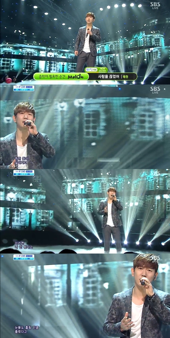 [아시아경제 e뉴스팀]가수 태원이 안정적인 보컬로 무대를 장악했다. 태원은 2일 오후 방송한 SBS '인기가요'에 출연해 신곡 '사랑을 끊었어'를 폭발적인 가창력으로 열창했다. 태원은 애절한 노랫말과 웅장한 오케스트라 사운드에 맞춰 더욱 짙어진 호소력을 자랑했다. 그는 마치 떠나간 여자를 무대에서 만난 듯이 애틋한 눈빛과 절절한 감성을 선보이며 노래해 청중의 감동을 이끌어냈다. '사랑을 끊었어'는 태원의 폭발적인 가창력이 그대로 느껴지는 곡으로 떠나보낸 사랑을 잊고 또 잊는 그리움의 반복을 매일 겪어가는 한 남자의 심정을 표현한 곡이다.한편 이날 방송에는 CNBLUE·동방신기·넬·베스티·에스엠 더 발라드·B.A.P·소유·정기고·선미·레이디스 코드·방탄소년단·소년공화국·립서비스·지피 베이직·멜로디데이·가물치·태원·스피드·1PS·GOT7·비투비가 출연했다. e뉴스팀 ent@asiae.co.kr<ⓒ세계를 보는 창 경제를 보는 눈, 아시아경제(www.asiae.co.kr) 무단전재 배포금지>