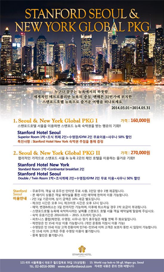 [아시아경제 임혜선 기자]스탠포드 호텔 서울은 스탠포드 호텔 그룹의 체인 호텔인 스탠포드 호텔 뉴욕과 스탠포드 호텔 서울을 합리적인 가격으로 이용할 수 있는 '스탠포드 서울 & 뉴욕 글로벌 패키지'를 5월 31일까지 판매한다.패키지는 총 2가지로, '서울 & 뉴욕 글로벌 패키지Ⅰ'과 '서울 & 뉴욕 글로벌 패키지 Ⅱ'로 구성된다. '서울 & 뉴욕 글로벌 패키지 Ⅰ·Ⅱ' 의 기본 구성 내용은 객실 1박, 조식 뷔페 2인, 수영장 2인 무료 이용, 사우나 50% 할인 서비스 등이다. 패키지 I 상품을 구매한 고객은 추첨을 통해 스탠포드 뉴욕 숙박권을 무료로 제공 받을 수 있으며, 패키지 Ⅱ 는 스탠포드 호텔 뉴욕의 스탠다드 룸 객실 1박, 컨티넨탈 조식 2인이 추가로 포함돼 있다. 글로벌 패키지 사용 유효 기간은 오는 31일까지다. 가격은 패키지 Ⅰ이 16만원, 패키지 Ⅱ가 27만원 (세금 별도)이다. 임혜선 기자 lhsro@asiae.co.kr<ⓒ세계를 보는 창 경제를 보는 눈, 아시아경제(www.asiae.co.kr) 무단전재 배포금지>
