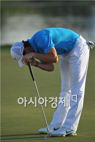 로리 매킬로이가 혼다클래식 최종일 16번홀에서 더블보기를 기록한 뒤 아쉬워하고 있다. 팜비치가든스(美플로리다주)=Getty images/멀티비츠.