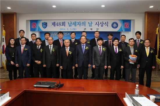 제48회 납세자의 날을 맞아 기획재정부장관상 및 관세청장상 수상자들이 백운찬(앞줄 왼쪽에서 6번째) 관세청장과 기념사진을 찍고 있다.