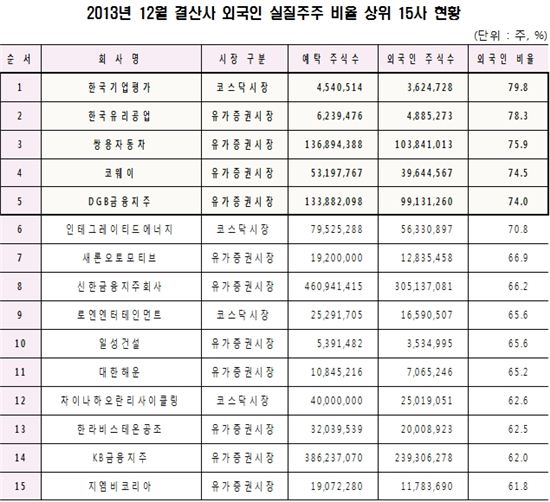 [아시아경제 박미주 기자]외국인 주주 비율이 가장 높은 회사는 한국기업평가인 것으로 나타났다. 외국인 주주 비율이 80% 정도에 달한다.4일 한국예탁결제원은 지난해 12월 결산사 중 외국인 실질주주 비율이 가장 높은 회사는 코스닥시장의 한국기업평가라고 밝혔다. 예탁주식 454만0514주 중 79.8%인 362만4728주가 외국인 주식수다.다음으로 한국유리공업(78.3%), 쌍용자동차(75.9%), 코웨이(74.5%), DGB금융지주(74.0%), 인테그레이티드에너지(70.8%), 새론오토모티브(66.9%), 신한금융지주회사(66.2%), 로엔엔터테인먼트(65.6%), 일성건설(65.6%) 등의 순이다.외국인 실질주주 비율이 50% 이상인 회사는 총 40사로 2012년 33사 대비 7사(21.2%) 증가했다. 유가증권시장의 경우 총 28사로 전체 유가증권시장 상장법인 738사 중 3.8%를 차지했다. 코스닥시장 상장법인의 경우 총 12사로 전체 코스닥시장 상장법인 1023사의 1.2%다.한편 지난해 12월 결산법인 주식투자자(실질주주)는 1607만명이고 중복 제외 시 481만명(법인포함)으로 집계됐다. 이는 2012년의 472만명 대비 1.9% 증가한 수치다.실질주주 1인당 평균 3.37종목, 1만3969주를 보유하고 있다. 전년 대비 보유종목수는 0.04개(1.2%), 보유주식수는 1316주(10.4%) 늘었다.실질주주 481만명 중 개인주주는 475만명으로 전체의 98.9%를 차지한다. 법인주주는 2만2000법인(0.5%), 외국인주주는 1만6000명(0.3%)이다.회사별 실질주주는 기아자동차가 22만6456명으로 가장 많았다. 이어 SK하이닉스(22만4153명), LG전자(20만7877명) 등의 순이다. 개인 실질주주는 성별로 남성의 비율(59.9%)이 높았다. 지역별로는 서울(30.9%)과 경기도(21.5%)가 다수였다.보유종목수는 1종목을 보유한 실질주주가 213만명(44.3%)으로 가장 많았다. 10종목 미만 보유 실질주주는 454만명으로 전체의 94.3%를 차지했다.
