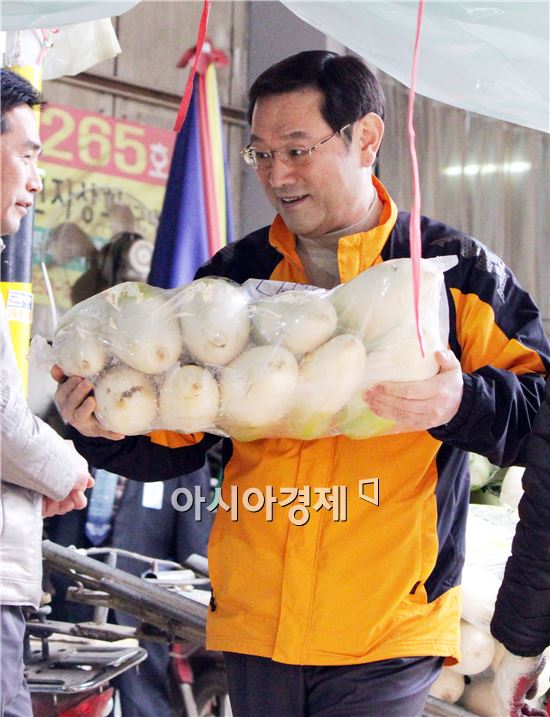 이용섭 의원이 광주시 북구 각화동 농수산물 도매시장을 방문해 무를 나르면서 민생챙기기에 나섰다.