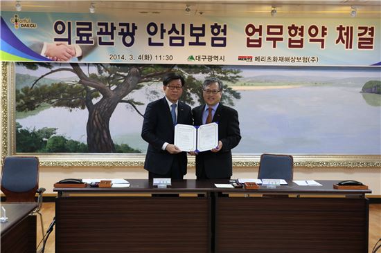 남재호 메리츠화재 대표이사 내정자(왼쪽)과 김연창 대구시 경제부시장이 의료관광 보험상품 지원을 위한 업무제휴 협약식을 마치고 기념촬영을 하고 있다.