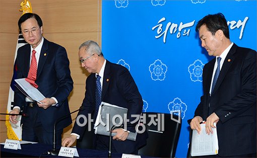 [아시아경제 윤동주 기자] 현오석 경제부총리 겸 기획재정부 장관(가운데)과 노대래 공정거래위원장(왼쪽), 신제윤 금융위원회 위원장이 6일 서울 세종로 서울청사에서 M&A 활성화방안 브리핑을 마친후 회견장을 나서고 있다.윤동주 기자 doso7@asiae.co.kr<ⓒ세계를 보는 창 경제를 보는 눈, 아시아경제(www.asiae.co.kr) 무단전재 배포금지>