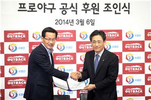 [아시아경제 이광호 기자]패밀리 레스토랑 아웃백 스테이크하우스가 한국 프로야구 공식 후원사가 됐다.아웃백은 한국 프로야구 위원회(KBO)와 공식 후원 기념 조인식을 진행했다고 7일 밝혔다. 아웃백이 한국 프로야구 공식 후원사로 나서는 것은 올해가 처음이며 연말까지 한국 프로야구와의 다양한 제휴 프로모션을 진행할 예정이다. 한종문 아웃백 대표는 "이번 조인식을 시작으로 아웃백은 한국의 프로야구 팬들을 겨냥한 올 시즌 다양한 프로모션을 선보일 계획"이라면서 "아웃백이 다국적으로 스포츠 마케팅을 활발히 벌이는 만큼 한국에서도 양사에 도움이 되는 파트너십을 중장기적으로 이어나갔으면 좋겠다"고 말했다. 이광호 기자 kwang@asiae.co.kr<ⓒ세계를 보는 창 경제를 보는 눈, 아시아경제(www.asiae.co.kr) 무단전재 배포금지>
