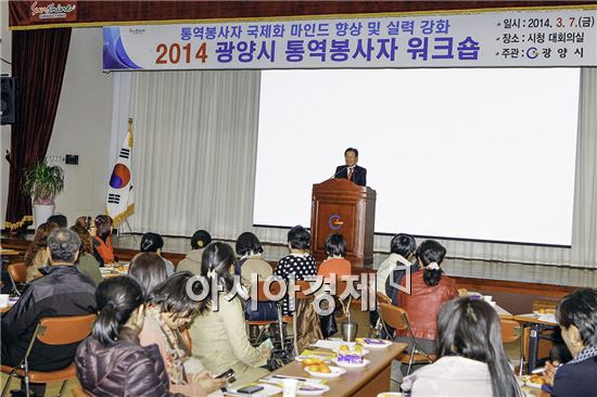 “ 최고 전문가가 경험한 실제 통역사례 중심 강의 ”[아시아경제 노해섭 기자]광양시가 7일 시청 대회의실에서 ‘통역봉사자 마인드 향상 및 실력 향상’을 위한 워크숍을 개최했다.광양시는 시 비전인 ‘글로벌 명품도시 조성’ 달성을 위해 현재 해외 유수 도시들과 국제교류를 전략적으로 추진하고 있다.이에 광양국제매화문화축제, 크루즈 입항 등 갈수록 늘어나는 통역 수요에 대응하기 위해 2012년 1월부터 명예통역관 및 통역 자원봉사자를 모집하여 통역 인력풀을 구축 운영 중이다.광양시 통역 인력풀은 현재 광양시 명예통역관 21명, 통역자원봉사자 169명 등 총 190명으로 구성되어 있다.광양시 통역봉사자는 지금까지 광양국제매화문화축제, 광양 국제교류도시 심포지엄 등 각종 국제 행사에서 통역 및 안내 활동을 하였으며, 향후 광양항 크루즈 입항, 국제교류도시 대표단 통역 등 국제행사 및 광양을 방문하는 외국인 관광객을 위한 통역을 담당하게 된다. 이날 워크숍에서는 평창 IOC위원 면담 통역, 덴마크 왕세자 내한 통역 등 굵직한 통역을 담당한 바 있고, 현재 서울외국어대학원 강사로도 왕성한 활동을 펼치고 있는 이준호 동시통역사가 다양한 통역사례 중심의 강의를 통해 워크숍 참가자들에게 재미는 물론 국제화 마인드 함양과 실력 강화에 큰 도움을 주었다.또한, 윤철혁 광양시 명예통역관의 통역 자원봉사 경험담 발표와 함께 광양시 국제화 시책 소개가 진행될 예정으로 통역 자원봉사자는 물론 외국어에 관심이 있는 학생, 시민들에게도 자기계발의 계기를 다지는 유익한 시간이 되었다.시 관계자는 “이번 워크숍이 광양시 통역봉사자들의 국제화 마인드 향상 및 자부심 제고, 통역 실력 향상의 계기가 될 것으로 기대하고 있다”며 “앞으로도 지속적인 워크숍 개최 및 통·번역 스쿨 운영 등을 통해 체계적인 교육과 관리를 해나갈 것이다”고 밝혔다.노해섭 기자 nogary@ <ⓒ세계를 보는 창 경제를 보는 눈, 아시아경제(www.asiae.co.kr) 무단전재 배포금지>