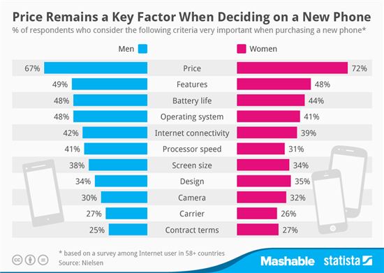 [아시아경제 심나영 기자] 스마트폰을 구입할 때 남녀노소 불문하고 저렴한 가격과 직관적인 디자인, 그리고 배터리 소모량을 가장 중요하게 생각하는 것으로 나타났다. 9일(현지시간) 정보기술(IT) 전문매체 매시어블(mashable)이 보도한 닐슨리서치(Nielsen survey) 조사에 따르면 이와 같은 공통점을 나타냈지만 남성과 여성 사이의 약간의 차이점은 존재했다. 닐슨리서치가 58개국 이상 국가를 대상으로 조사했을 때 여성은 가격에 더 민감하고, 약정기간에 신경을 쓰며 카메라 성능에 관심을 가지고 있는 것으로 나타났다. 반면 남성은 운영체제나 화면 사이즈, 속도를 중요시했다. 심나영 기자 sny@asiae.co.kr<ⓒ세계를 보는 창 경제를 보는 눈, 아시아경제(www.asiae.co.kr) 무단전재 배포금지>