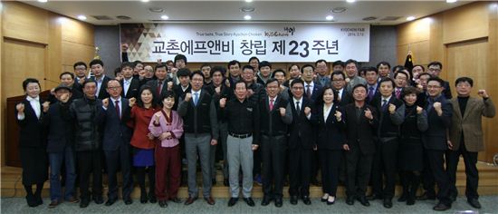 [아시아경제 이정민 기자]교촌에프앤비(회장 권원강)는 13일 창립 23주년을 맞아 창립기념 행사를 개최했다.권원강 회장은 “2014년은 교촌에 있어서 글로벌 탑-티어 브랜드로 도약하기 위한 비전을 선포한 중요한 한 해”라며 “동남아시아 지역에 활발히 진출한 작년처럼 올해애도 교촌의 전 임직원 및 가맹점들과 함께 ‘글로벌 교촌’을 위한 역량을 키워 나갈 것”이라고 밝혔다.이날 창립기념 행사에선 전국 교촌 가맹점 중 총 27개의 최우수·우수·장려 가맹점 등을 시상하고, 다양한 부문의 임직원 시상도 함께 진행됐다. 최우수 가맹점에는 경남 월영점이 선정됐으며, 20개의 우수 가맹점, 6개의 장려상 가맹점을 선정해 시상했다.우수지사 시상 및 유공직원, 장기근속직원, 모범직원, 우수부서를 선정해 시상하고, 교촌 임직원들의 노고를 치하하는 시간도 가졌다. 교촌에프앤비는 지난해 인도네시아, 말레이시아, 필리핀, 태국 등에 진출하고 새로운 치맥 문화를 형성하는 등 활발한 해외사업을 펼치고 있다.이정민 기자 ljm1011@asiae.co.kr<ⓒ세계를 보는 창 경제를 보는 눈, 아시아경제(www.asiae.co.kr) 무단전재 배포금지>