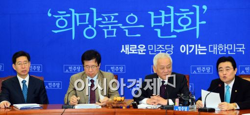 [아시아경제 최우창 기자]14일 민주당 최고위원회의가 열린 서울 여의도 국회 당 대표실에서 전병헌 원내대표가 모두발언을 하고 있는 가운데 김한길 대표가 미소를 짓고 있다.최우창 기자 smicer@asiae.co.kr<ⓒ세계를 보는 창 경제를 보는 눈, 아시아경제(www.asiae.co.kr) 무단전재 배포금지>