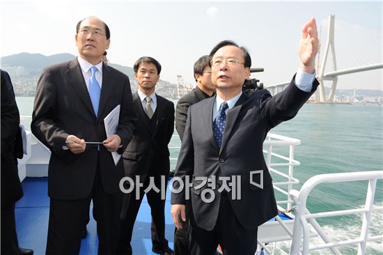 [아시아경제 조슬기나 기자]1박2일 일정으로 부산을 찾은 이주영 해양수산부 장관이 14일 배를 타고 북항 재개발 현장을 둘러보고 있다.부산=조슬기나 기자 seul@asiae.co.kr<ⓒ세계를 보는 창 경제를 보는 눈, 아시아경제(www.asiae.co.kr) 무단전재 배포금지>
