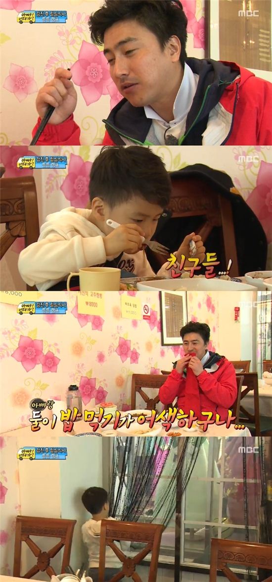 [아시아경제 e뉴스팀]전 국가대표 축구 선수 안정환이 아들과 어색한 '먹방'을 찍었다.16일 오후 방송한 MBC '일밤-아빠! 어디가?'에서 안정환과 그의 아들 안리환은 중국집에서 자장면을 먹었다. 그러나 안리환은 먹는데 집중하지 못하는 모습을 보였다. 이들은 이 날 처음 둘이서 외식을 했던 것. 안리환은 "아빠랑 밥 먹는 것 보다 친구들이랑 밥 먹는 게 좋다"며 어색하게 말을 이어갔다. 결국 그는 의자에서 일어나 식당 창문 옆에서 딴 짓을 했다. 안정환은 혼자 자리에 남겨져 외롭게 남은 음식을 먹었다.한편 이 날 방송에서 아이들은 봄맞이 어린이 튼튼 캠프에서 건강 검진을 받고 2014 소치 올림픽 금메달리스트 조해리, 이상화, 박승희 선수들에게 스케이트를 배웠다.e뉴스팀 ent@asiae.co.kr<ⓒ아시아경제 & 스투닷컴(stoo.com)이 만드는 온오프라인 연예뉴스>