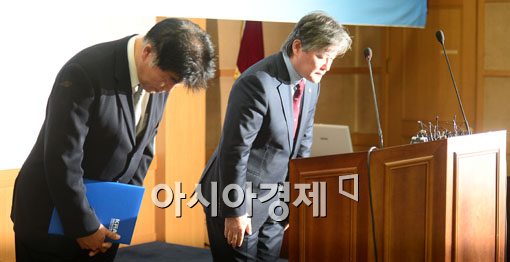 [아시아경제 백소아 기자] 17일 서울 용산구 대한의사협회관에서 열린 대한의사협회 기자회견에서 (왼쪽부터)최재욱 의료정책연구소장과 노환규 대한의사협회장이 원격진료 등 의료정책 관련 의·정 협의를 발표한 후 인사를 하고 있다. 의사협회는 이날 저녁부터 20일 정오까지 이번 의정협의안에 대한 회원 찬반투표를 실시해 24일로 예정된 집단휴진에 대해 결정할 예정이라고 밝혔다.백소아 기자 sharp2046@asiae.co.kr<ⓒ세계를 보는 창 경제를 보는 눈, 아시아경제(www.asiae.co.kr) 무단전재 배포금지>