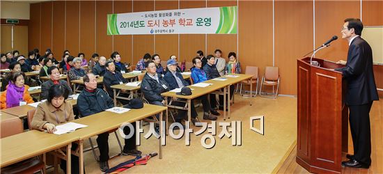 [아시아경제 노해섭 기자]광주광역시 동구(청장 노희용)는 17일 벤처빌딩 대강당에서 임영일 부구청장, 채명희 동구의회의장, 수강생 등이 참석한 가운데 도시농부학교 입학식을 개최했다. 이종국 광주전남귀농학교 강사는 주민들을 대상으로 도시농업의 이해, 농사계획, 작목별 재배방법 등을 교육하고 텃밭관리 방법, 모종심기 요령 등의 현장학습도 실시한다. 사진제공=광주시 동구노해섭 기자 nogary@ <ⓒ세계를 보는 창 경제를 보는 눈, 아시아경제(www.asiae.co.kr) 무단전재 배포금지>