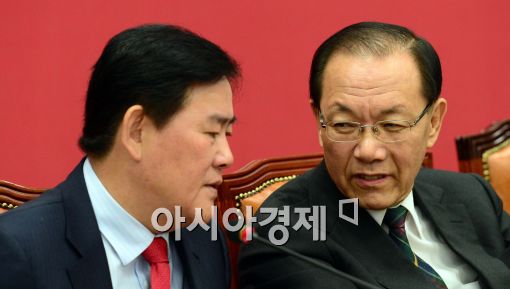 [아시아경제 최우창 기자]황우여(오른쪽) 새누리당 대표와 최경환(왼쪽) 원내대표가 19일 오전 국회에서 열린 최고중진연석회의에서 이야기를 나누고 있다.최우창 기자 smicer@asiae.co.kr<ⓒ세계를 보는 창 경제를 보는 눈, 아시아경제(www.asiae.co.kr) 무단전재 배포금지>