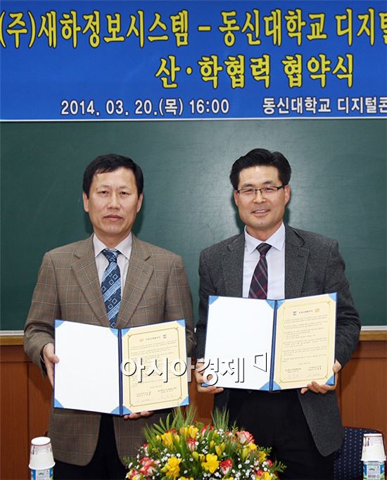 새하정보시스템 이재현 대표이사(왼쪽)가 동신대 디지털콘텐츠학과(학과장 주낙근)에 장학금 1000만원을 기부하고 기념촬영을 하고있다.