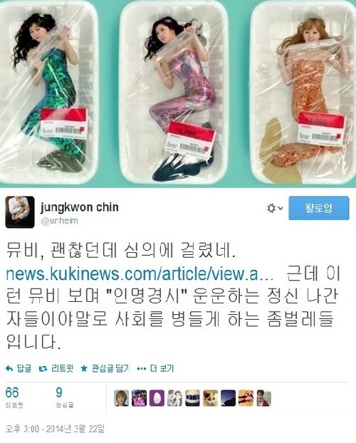 [아시아경제 온라인이슈팀] 진중권 동양대학교 교수가 걸그룹 오렌지캬라멜의 신곡 '까탈레나' 뮤직비디오가 KBS 방송부적격 판정을 받은 것에 대해 일침을 가했다.진 교수는 22일 자신의 소셜네트워크서비스(SNS) 트위터(@unheim)에 "뮤비 괜찮던데 심의에 걸렸네"라며 "근데 이런 뮤비 보며 '인명경시' 운운하는 정신 나간 자들이야말로 사회를 병들게 하는 좀벌레들입니다"라는 글을 올렸다.'까탈레나'는 MBC와 SBS에 이어 21일 KBS에서도 뮤직비디오 3월 3주차(3월14~20일) 심의에서도 방송부적격 판정이 내려졌다. 방송부적격으로 문제 삼는 장면은 인어로 분한 오렌지 캬라멜 멤버들이 비닐 포장팩 안에 들어가 꿈틀거리는 모습으로 인명경시, 즉 사람의 생명을 함부로 여기는 듯한 장면이 들어갔다는 이유다.오렌지캬라멜은 '까탈레나' 뮤직비디오에서 초밥을 떠올리는 모습을 한 채 밥알 위에 올라가거나 비닐 포장지에서 꿈틀대는 연기를 펼쳤다.'까탈레나'가 방송부적격 판정을 받자 네티즌은 "까탈레나, 보기엔 괜찮은데?" "까탈레나, 인명경시 운운해?" "까탈레나, 또 뮤직비디오 봐야지" 등의 반응을 보였다.온라인이슈팀 <ⓒ세계를 보는 창 경제를 보는 눈, 아시아경제(www.asiae.co.kr) 무단전재 배포금지>