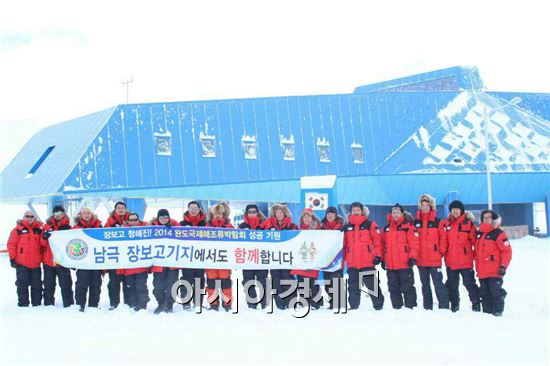 남극 장보고과학기지에 월동대원으로 파견근무중인 20여명의 대원들이 장보고의 고향에서 열리는 완도국제해조류박람회 성공 개최를 기원하는 메시지로 보내왔다.