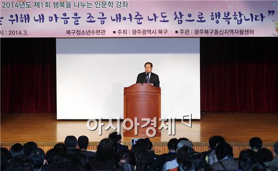 광주 북구(청장 송광운)는 21일 청소년수련관 대강당에서 자활사업 참여자와 공무원, 주민 등을 대상으로 자활 참여자의 삶의 질 향상을 위한 2014년 제1회 행복을 나누는 인문학 강좌를 개최했다. 사진제공=광주시 북구<br />