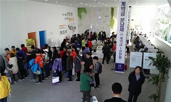 지난 23일 돈암 코오롱하늘채 견본주택에 실수요자들이 대거 몰리며 인산인해를 이뤘다.