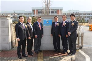김준기 KGC인삼공사 대표이사(왼쪽 네번째)가 한국인삼연구원의 '국가 지정 데이터 센터' 인증 획득 현판식에 참여, 기념 촬영을 하고 있다.