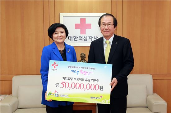 [아시아경제 이초희 기자]건설공제조합(이사장 정완대)과 대한적십자사(총재 유중근)은 24일 대한적십자사 본사에서 ‘희망드림 프로젝트’ 기부금 전달식을 가졌다. 이날 전달한 기부금(5000만원)은 저소득 가정의 주거환경을 개선하고 조손가정을 지원하는데 사용된다.건설공제조합은 지난 2011년 대한적십자사와 사회공헌협약을 체결한 이후 임직원들의 자발적 모금과 회사 지원금으로 기부금을 조성하여 희망드림 프로젝트를 진행하고 있다. 이초희 기자 cho77love@asiae.co.kr<ⓒ세계를 보는 창 경제를 보는 눈, 아시아경제(www.asiae.co.kr) 무단전재 배포금지>