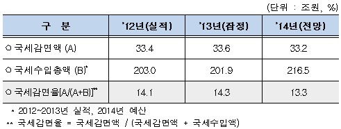 [아시아경제 이경호 기자]정부가 연간 33조원에 이르는 조세감면 규모를 더이상 늘어나지 않도록 총량제로 관리하기로 했다. 이를 위해 서민 중소기업 등 필수부문에 대한 세제혜택도 현행대로 유지하거나 축소해나가고 대기업,고소득층 등 불요불급한 부문에 대해서는 세제혜택을 줄이기로 했다. 비과세 감면도 대폭 폐지 또는 축소하고 이를 신설할 때는 일몰제를 적용하되 기존 감면제도를 줄여 총액과 총량제로 관리하기로 했다. 경기지표의 개선으로 경기가 점차 회복될 것으로 전망되지만 대내외 불확실성으로 인해 안정적으로 세금을 걷기가 쉽지 않다고 판단, 세금을 깎아주는 것은 최대한 줄이고 걷은 세금은 최대한 알뜰하게 쓰겠다는 방침이다. 정부가 25일 국무회의에 제출한 2014년도 조세지출 기본계획(안)을 보면 올해 국세감면액은 전체 230개 비과세·감면에서 총 33조2000억원으로 국세감면율율은 13.3% 수준이다. 국세감면율은 감면액과 수입액을 합한 금액에서 감면액을 나눈 값이다.지난해는 33조6000억원, 감면율은 14.3%로 역대 최대였다가 지난해 비과세와 감면제도를 정비해 올해는 조금 줄어들었다. 정부는 국세감면한도를 정하는데 이는 직전 3개년 평균 감면율에 0.5%포인트를 곱한 수치로서 2012년(14.8%), 2013년(14.8%), 2014년(14.8%전망) 등이다. 이를 감안하면 국세감면한도 금액은 올해 37조원 가량이다. 향후 국세수입 등을 감안하면 40조 이내로 묶는다는 구상이다.수혜자별로는 개인이 65%, 기업이 33%. 개인중에서는 60%가 서민,중산층에 속하고 기업의 절반(53.6%)가량이 중소기업이다. 감면분야별로 보면 근로자지원(근로장려세제 포함)이 32.4%, 농어민지원이 16.3%, 연구개발이 10.3% 등의 순을 보였고 투자고용은 6.5%, 중소기업은 4.6%를 차지했다.◆돈 쓸곳은 많고 걷어야할 세금도 많고=정부가 올해부터 역점을 두고 추진하는 경제혁신 3개년 계획의 적지 않은 실행과제는 세제지원을 담고 있다. 사회안전망을 강화해야 하고 중소중견기업의 글로벌화, 벤처기업의 인수합병 육성, 임대시장 안정, 금융, 고용 등의 활성화에 세제지원이 필수적이다. 정부는 2013부터 2017년까지 총 18조원의 세입을 확충한다는 목표다. 지난 2012~2013년 세법개정을 통해 약 15조원의 세입을 확충했으며 2014~2015년 기간 중 약 3조원을 추가로 마련해야 한다. 올해는 또 내년부터 도입되는 조세지출 일몰도래 및 신설제도에 대한 성과평가 의무화에 대비해야한다. 일몰도래 제도에 대해 기획재정부장관은 전문연구기관을 통해 조세지출 심층평가 을 수행해서 감면제도 신설시 조세지출 예비타당성조사를 하고 그 평가결과에 따라 신설검토 대상을 선정하도록 했다. 이 예비타당성조사는 예산사업 예비타당성 조사와 유사하며, 2015년부터 예비타당성조사를 받지 않은 경우 일정규모 이상의 조세감면 신설을 제한받는다. 올해는 또 조세지출 성과평가를 위한 시행령 및 평가지침 마련, 자문회의 구성 등 평가기반도 구축해야 한다. ◆일몰 최대한 지키고 신설은 억제=정부의 조세지출 원칙은 기한이 끝나는 조세감면은 기한을 지켜 일몰하고 새로 만드는 것은 최대한 억제하되 불가피하게 신설되면 기존의 조세감면의 숫자나 감액규모를 줄이기로 했다. 올해 일몰이 도래하는 제도는 53개, 7조8000억원 규모다. 올해는 일몰이 도래하면 원칙적으로 종료하되, 꼭 필요한 경우에는 성과평가등을 통해 재설계 후 시행하기로 했다. 2015년부터는 일정규모 이상(예: 연간 100억원)의 일몰도래 제도에 대해 의무적으로 전문연구기관의 성과평가를 실시해야한다. 조세감면 재설계시 정책목적, 조세지원 필요성 및 효과, 세출예산과 중복, 해외사례, 소관부처 의견 등을 종합적으로 검토해야한다.중소기업, 취약산업, 서민ㆍ중산층, 사회적 취약계층에 대한 세제지원제도는 세부담이 크게 늘어나지 않도록 현행 유지하거나 단계적으로 축소하기로 했다.정부부처의 비과세ㆍ감면 신설 건의시 기존 비과세ㆍ감면 축소 대안(PAYGO 원칙)을 제출하는 방안도 추진된다. 기존 비과세ㆍ감면을 축소하는 대안이 합리적인 경우 새로운 비과세ㆍ감면 신설을 우선적으로 검토하게 된다. ◆비과세 감면 3년 원칙=비과세·감면은 3년 단위로 설정하는 것을 원칙으로 하되 예외적으로 감면제도의 실효성 제고를 위해 필요한 경우 최대 5년까지 설정할 수 있게 했다. 국제행사 지원 등 적용기한이 명확한 경우에는 해당 국제행사 등의 종료일을 감안해 적용기한을 설정키로했다. 신규 조세감면 도입이 불가피한 경우 외에는 예외없이 최저한세 적용대상에 포함시키기로 했다. 세출예산과 지원목적, 수혜자가 중복되는 경우에는 이중혜택을 받지 못하도록 지속적으로 개선하기로 했다. 일례로 국가 등의 보조금으로 시설투자나 연구개발 지출시 세제지원을 배제하거나 국가장학금은 교육비 특별공제 대상에서 제외하는 방안 등이다.정부는 투자, 고용 등 정책목적을 위한 세액공제율은 원칙적으로 10% 이내로 설정(근로소득 관련 세액공제 제외)하기로 했다. 현재 중소기업의 연구개발비용세액공제(25%)를 제외하고 대부분 3~10% 수준에서 운영되고 있으나, 개정건의시 20% 