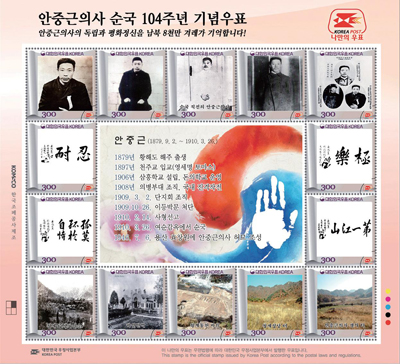 [아시아경제 온라인이슈팀] 안중근 의사의 순국 104주년을 맞아 기념 우표가 발행됐다.26일 민족문제연구소와 안중근의사기념사업회가 기획한 '안중근 의사 서거 104주년 기념 우표첩'이 발행됐다. 안중근(1879~1910)의사는 1910년 2월14일 사형을 선고받고 다음달 26일 순국했다.지난 2010년 안 의사 서거 100주년을 기념해 우정사업본부에서 우표를 발행했지만, 민간이 처음으로 주도해 우표를 제작한 것은 이번이 처음이다.민족문제연구소와 안중근의사기념사업회 이사장 함세웅 신부는 "이 우표를 통해 안중근의사의 민족에 대한 사랑과 세계평화 구현의 뜻을 알리고 미래 세대의 올바른 역사관 형성에 도움이 되기를 희망한다"고 밝혔다.안중근 의사 순국 104주년 기념 우표첩은 안중근 의사의 순국 직전 모습, 의거 당시의 하얼빈역 전경, 유언 등 의미있는 사료로 구성됐다.특히 우표첩에는 기념사업회가 2012년 11월 직접 북한을 방문해 찍은 황해도 해주 청계동 안 의사 생가 터, 성당터의 모습이 담겨있다. 이는 이번에 최초로 공개된 것이다.민족문제연구소 관계자는 "안중근 의사는 남북 모두에서 인정받는 민족의 대표 독립운동가"라며 "북한의 협조로 해주를 직접 방문해 우표를 만든 만큼 안 의사의 동북아 평화정신에 부합하는 의미가 있다"고 의의를 밝혔다.우표첩은 1만개가 생산됐으며 가격은 1만3000원이다. 민족문제연구소 홈페이지 등을 통해 구입할 수 있다. 수익금은 전액 안중근 의사기념·연구 사업에 쓰일 예정이다.안중근 의사 순국 104주년 소식에 네티즌은 "안중근 의사 순국 104주년, 이토를 죽인 15가지 이유도 화제" "안중근 의사 순국 104주년, 중국에서도 기념 행사 열린다는데""안중근 의사 순국 104주년, 의미 새기자" 등의 반응을 보였다.온라인이슈팀 <ⓒ세계를 보는 창 경제를 보는 눈, 아시아경제(www.asiae.co.kr) 무단전재 배포금지>
