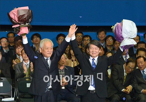 [아시아경제 윤동주 기자] 26일 서울 송파구 올림픽홀에서 열린 새정민주연합 창당대회에서 공동 대표로 선출된 김한길, 안철수 공동 창당준비위원장이 손을 들어 인사를 하고 있다.윤동주 기자 doso7@asiae.co.kr<ⓒ세계를 보는 창 경제를 보는 눈, 아시아경제(www.asiae.co.kr) 무단전재 배포금지>