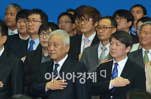 [아시아경제 윤동주 기자] 26일 서울 송파구 올림픽홀에서 열린 새정민주연합 창당대회에서 공동 대표로 선출된 김한길, 안철수 공동 창당준비위원장이 국민의례를 하고 있다.윤동주 기자 doso7@asiae.co.kr<ⓒ세계를 보는 창 경제를 보는 눈, 아시아경제(www.asiae.co.kr) 무단전재 배포금지>