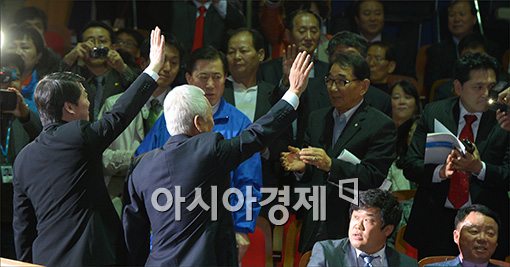 [아시아경제 윤동주 기자] 26일 서울 송파구 올림픽홀에서 열린 새정치민주연합 창당대회에서 공동 대표로 선출된 김한길, 안철수 공동 창당준비위원장이 손을 들어 인사를 하고 있다.윤동주 기자 doso7@asiae.co.kr<ⓒ세계를 보는 창 경제를 보는 눈, 아시아경제(www.asiae.co.kr) 무단전재 배포금지>