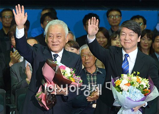 [아시아경제 윤동주 기자] 26일 서울 송파구 올림픽홀에서 열린 새정민주연합 창당대회에서 공동 대표로 선출된 김한길, 안철수 공동 창당준비위원장이 꽃다발을 받고 활짝 웃고 있다.윤동주 기자 doso7@asiae.co.kr<ⓒ세계를 보는 창 경제를 보는 눈, 아시아경제(www.asiae.co.kr) 무단전재 배포금지>