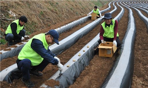 건설공제조합 봉사단이 감자를 파종하고 있다.<br />