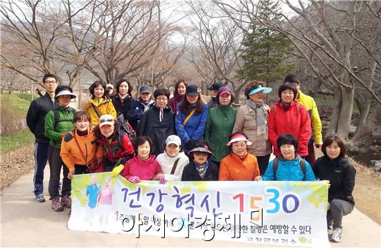 "귀농 귀촌 건강교실 걷기 캠페인 실시"[아시아경제 김재길 기자]고창군(군수 이강수) 보건소는 “건강플러스 행복플러스”를 슬로건으로 귀농인과 지역주민이 함께 하는 귀농귀촌 건강교실을 1월부터 진행해 27일 마무리했다.이번 건강교실은 스스로 습관을 개선하여 건강을 증진시키기 위한 12주 프로그램(1~3월)으로 가정에서 중추적 역할을 하는 중년 여성을 대상으로 진행됐다.주 2회(화·목) 근력강화 및 유산소 운동을 실시하고 만성질환, 영양, 금연, 구강보건, 건강한 식생활 관리 및 칼로리 장보기, 미각체험 등 이론과 실습을 병행하는 통합건강증진 프로그램을 제공하여 높은 만족도를 얻었다.프로그램 중 하나인 걷기 캠페인은 지난 20일 선운산에서 실시했으며 걷기가 끝난 후 선운산 유스호스텔에서 레크리에이션을 통해 기쁨과 화합의 한마당 “사람과 자연이 아름다운 고창”을 체험하는 즐거운 시간을 가졌다.마지막으로 사후관리를 통해 프로그램 시행 전후를 비교하여 식생활 습관과 신체 변화를 한눈에 알아볼 수 있는 평가를 시행했다.군 관계자는 “이 평가를 통해 참가자들은 자신을 돌아볼 수 있는 계기를 마련하고 프로그램이 끝난 후에도 지속적으로 올바른 습관이 유지되기 바란다”고 강조했다.김재길 기자 <ⓒ세계를 보는 창 경제를 보는 눈, 아시아경제(www.asiae.co.kr) 무단전재 배포금지>