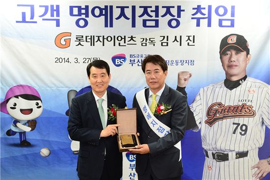 ▲성세환 BS금융그룹 회장(사진 왼쪽)은 27일 부산은행 사직운동장지점에서 김시진 롯데자이언츠 감독에게 명예지점장 위촉장을 전달하고 기념사진을 촬영했다.