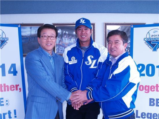 6년 4개월여 만에 국내 무대에 복귀한 임창용(가운데)이 지난 26일 경산볼파크에서 삼성과 계약을 체결한 뒤 김인 사장(왼쪽), 송상봉 단장과 기념촬영을 하고 있다.[사진 제공=삼성 라이온즈]